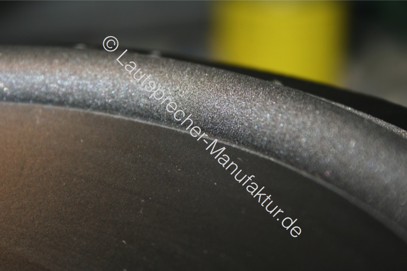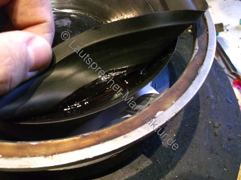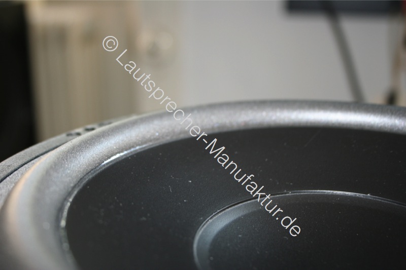 Zuletzt muss aber auch die Höhe der Klebeflächen passen. Die Null Position des Schwingteils, also wenn die Schwingspule ihre Ruheposition im Luftspalt hat (Schwingspule sitzt mittig zur Polplatte) und die Zentrierspinne glatt ist, müssen mit der Position der beiden Klebeflächen der Sicke zusammen passen. Oft kommt es vor dass die Sicke das Schwingteil eindruckt oder herauszieht sodass die Schwingspule asymmetrisch im Luftspalt sitzt. Hierdurch kann die Zentrierspinne auf dauer überdehnt werden sowie dauerhaft Schaden nehmen.